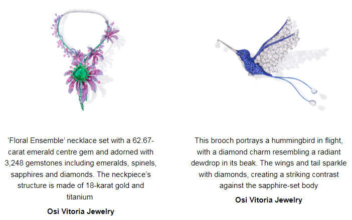Osi Vitoria Jewelry, a Hong Kong-based brand, is presenting collections inspired by nature’s beauty. At JGA, the jeweller will highlight its expertise in harmoniously blending colours that range from soft pinks to vibrant purples, greens and blues. One of its masterpieces is “Floral Ensemble,” a bold necklace that combines a rigid structure embellished with emeralds and a garland-like design of wild orchids. The floral arrangement features a seamless gradient of colours, transitioning from white and blush to shades of pink and purple. The necklace features a 62.67-carat emerald pendant, against a backdrop of 3,248 gemstones, comprising emeralds, spinels, fancy sapphires and diamonds. Designed to rest delicately on the collarbone, the piece is crafted in 18-karat gold and titanium.
